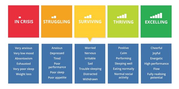 We need to understand that our mental health and wellbeing fall on a continuum which include a range of states between mental health and mental illness. It is also important to understand that we can experience several states within the continuum during different periods throughout our lives. The picture depicts the 5 stages of the mental health continuum, along with things we might experience or recognize during each stage. The good news is we have the ability to shift between stages and work towards optimal mental health. If you find yourself in a stage of surviving, struggling, or in crisis, please know that you are not alone and there are people and resources to help along the continuum.